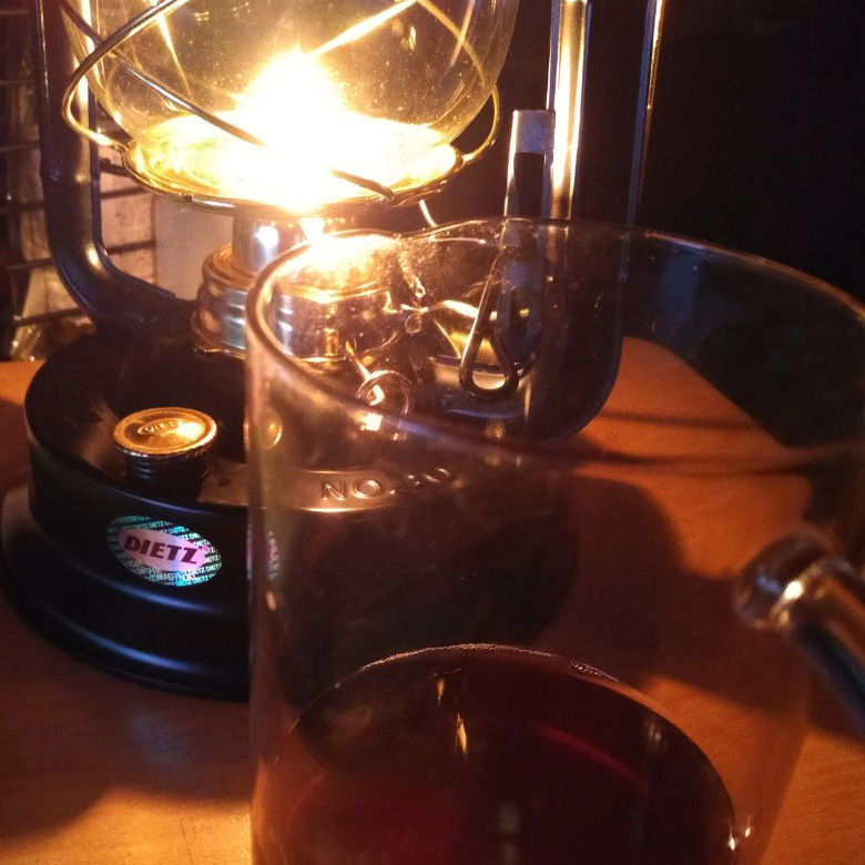 コーヒーとオイルランタンです。ただのコップとみるとランタンが小さく見えるかもしれませんが、おじさんはピッチャーで飲まないと満足できない体になってしまっていますので、このコップ500-600mlくらいです。ですからオイルランタン直径20cmくらいあります。