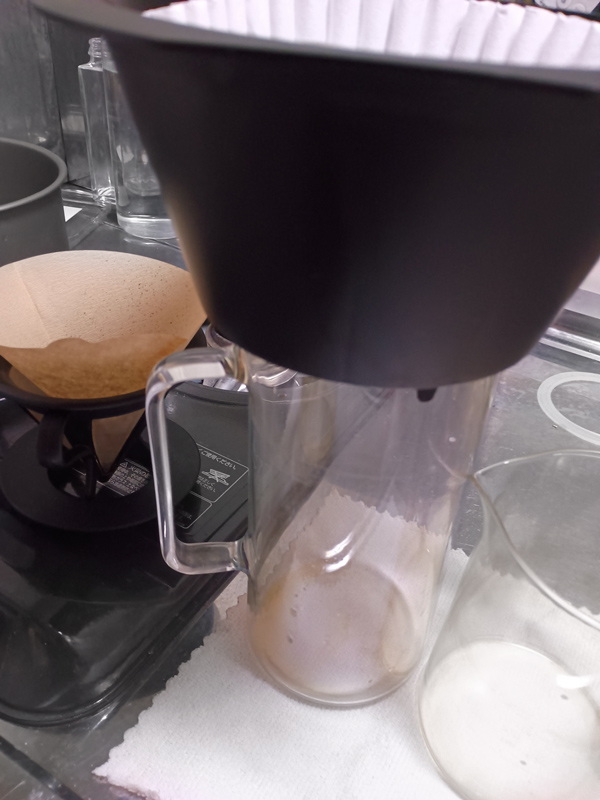 おじさん思いました。ペーパーフィルターが小さいのです。一般サイズのV60の4人用のフィルターで淹れていますので1.5リットルで淹れるなんてそれは許容を越えています。